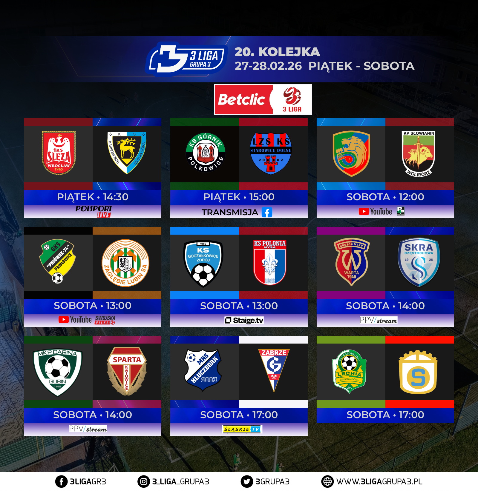 14.02.2026r. Sobota godz.12:00 | Jelenia Góra | – KS Karkonosze Jelenia Góra (Betclic 3 Liga grupa 3) – KP Słowianin Wolibórz (Betclic 3 Liga grupa 3)