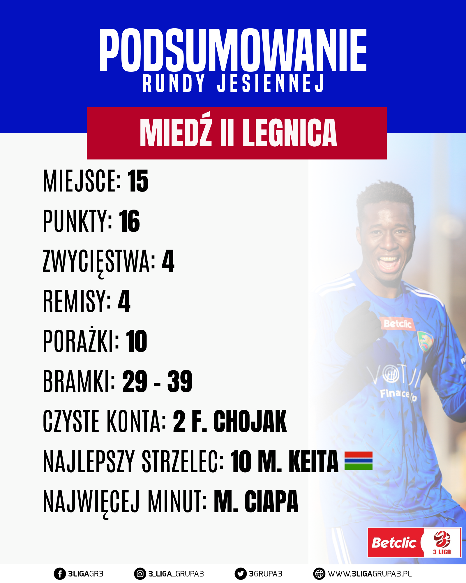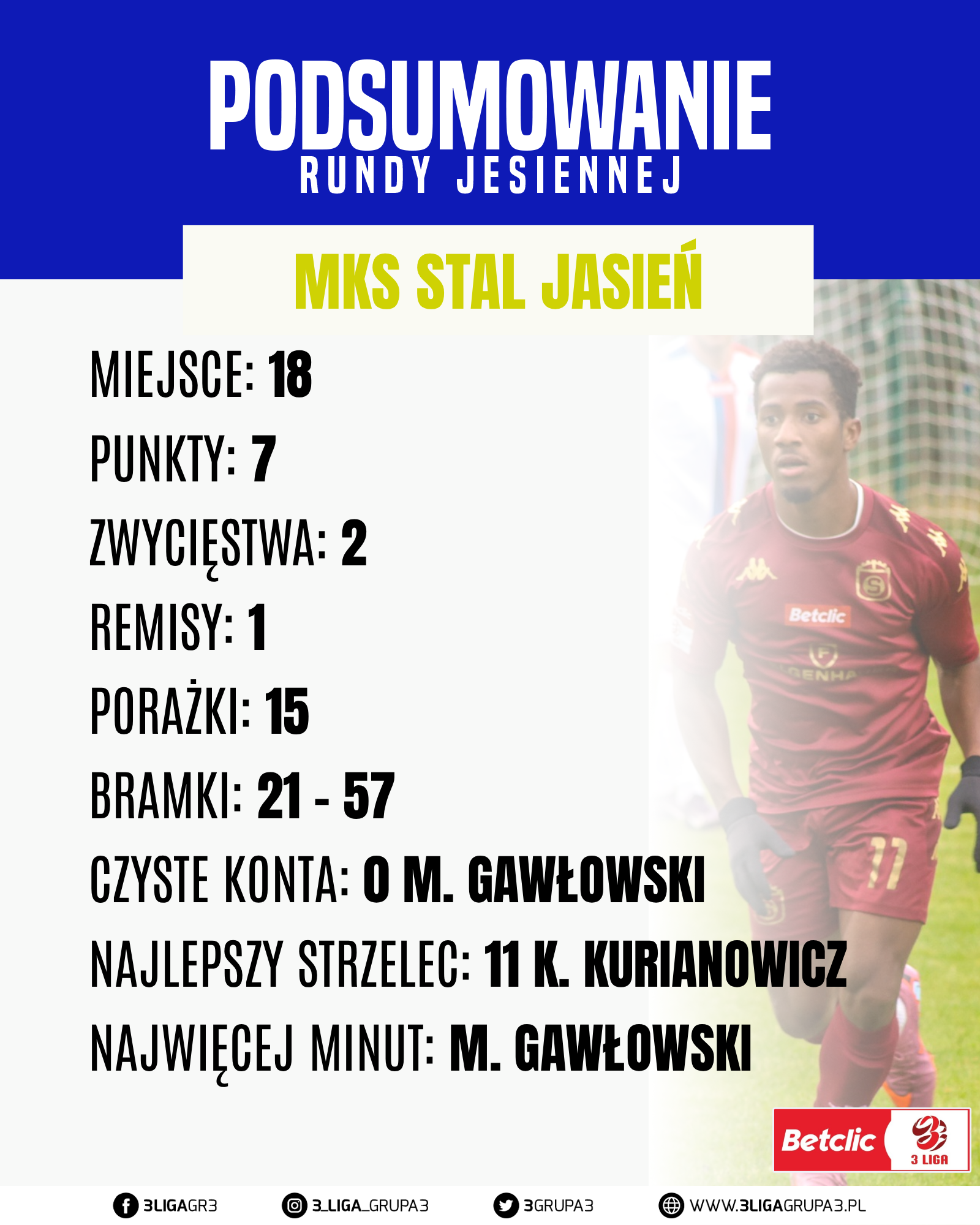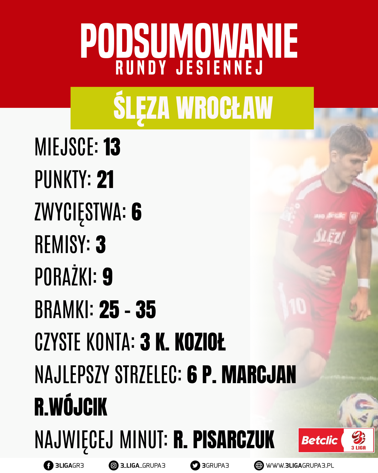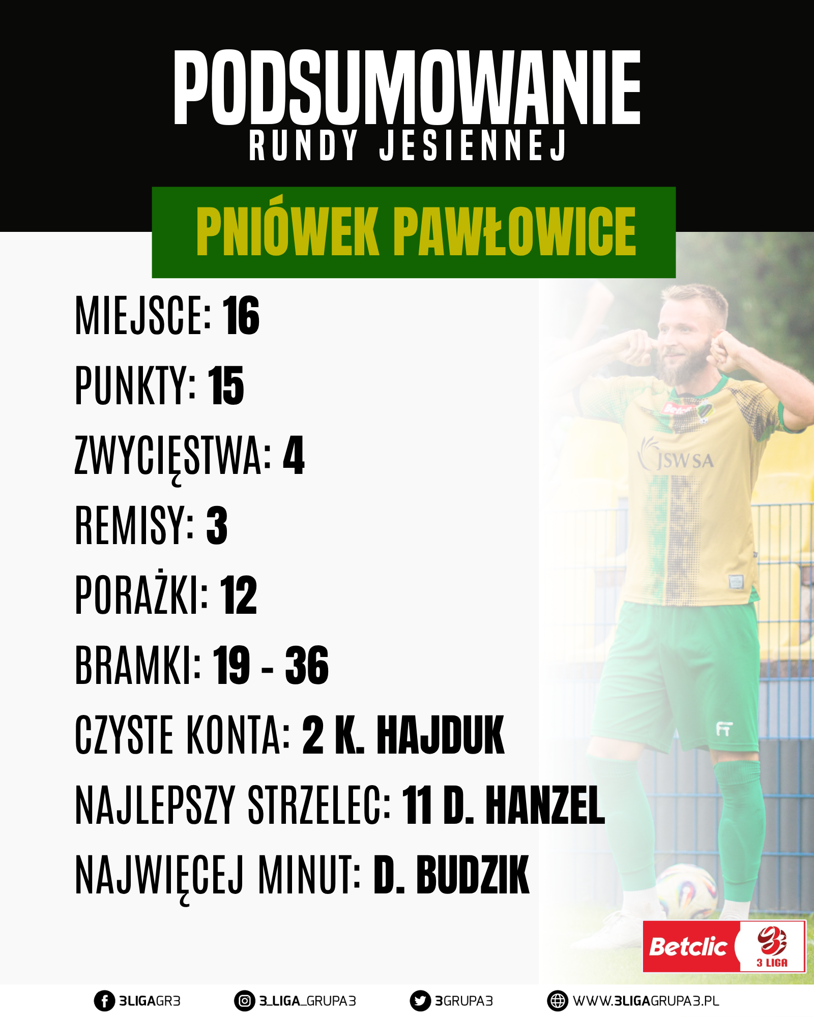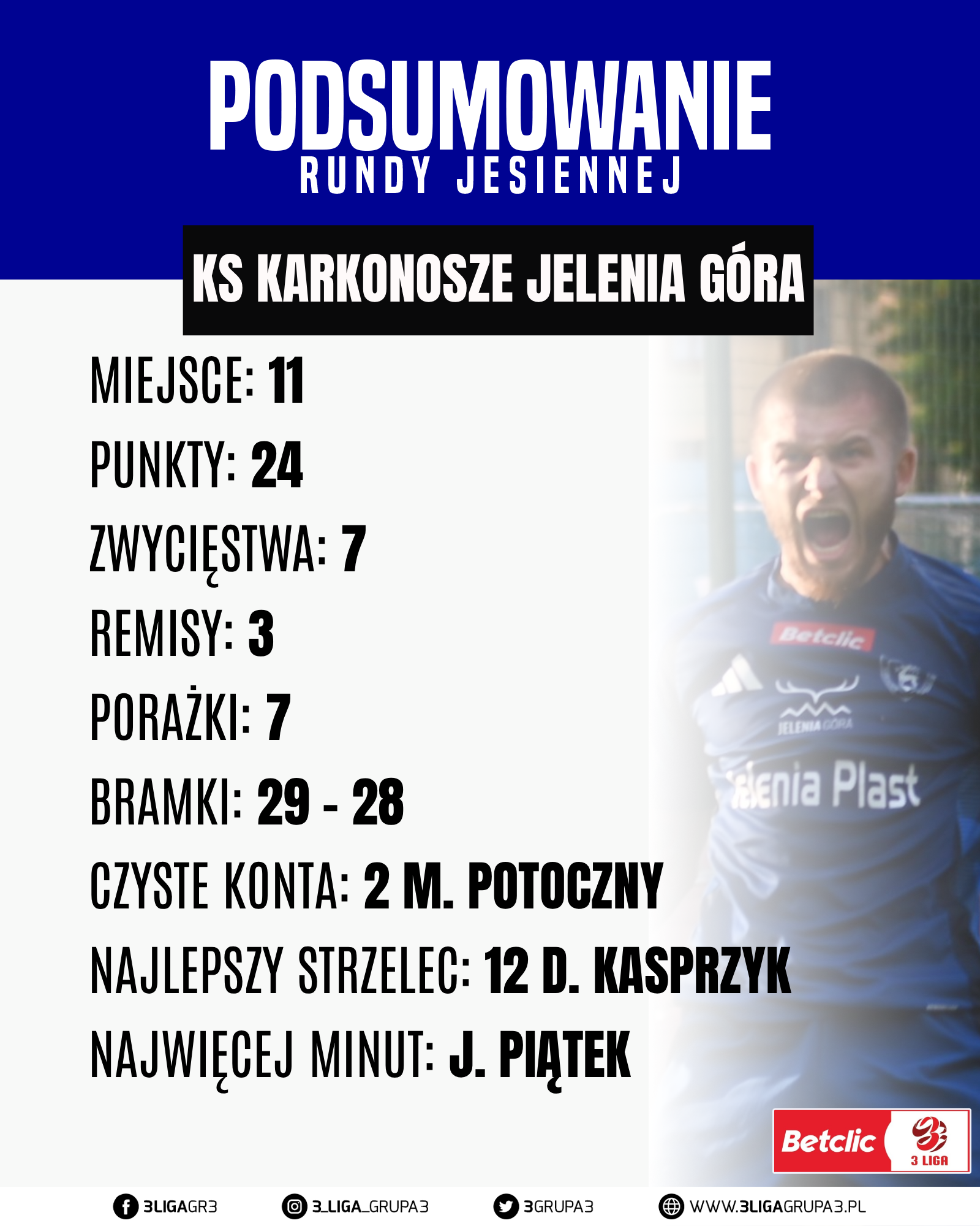 Po pierwszej rundzie miejsce 11 zajmuje zespół KS Karkonosze Jelenia Góra ta drużyna rozegrała 17 z 19 spotkań, z dorobkiem 24 punktów odnieśli 7 zwycięstw, zaliczyli 3 remisy i przegrali 7 spotkań ich bilans bramkowy to 29 – 28. Kadra Polonii w tej rundzie liczyła 27 zawodników W tej drużynie są młodzi oraz też doświadczeni gracze. Mieli lepsze momenty, oraz też te gorsze. W tej drużynie występował w rundzie jesiennej 4 zawodników z zagranicy. O to nasze krótkie podsumowanie po rundzie jesiennej