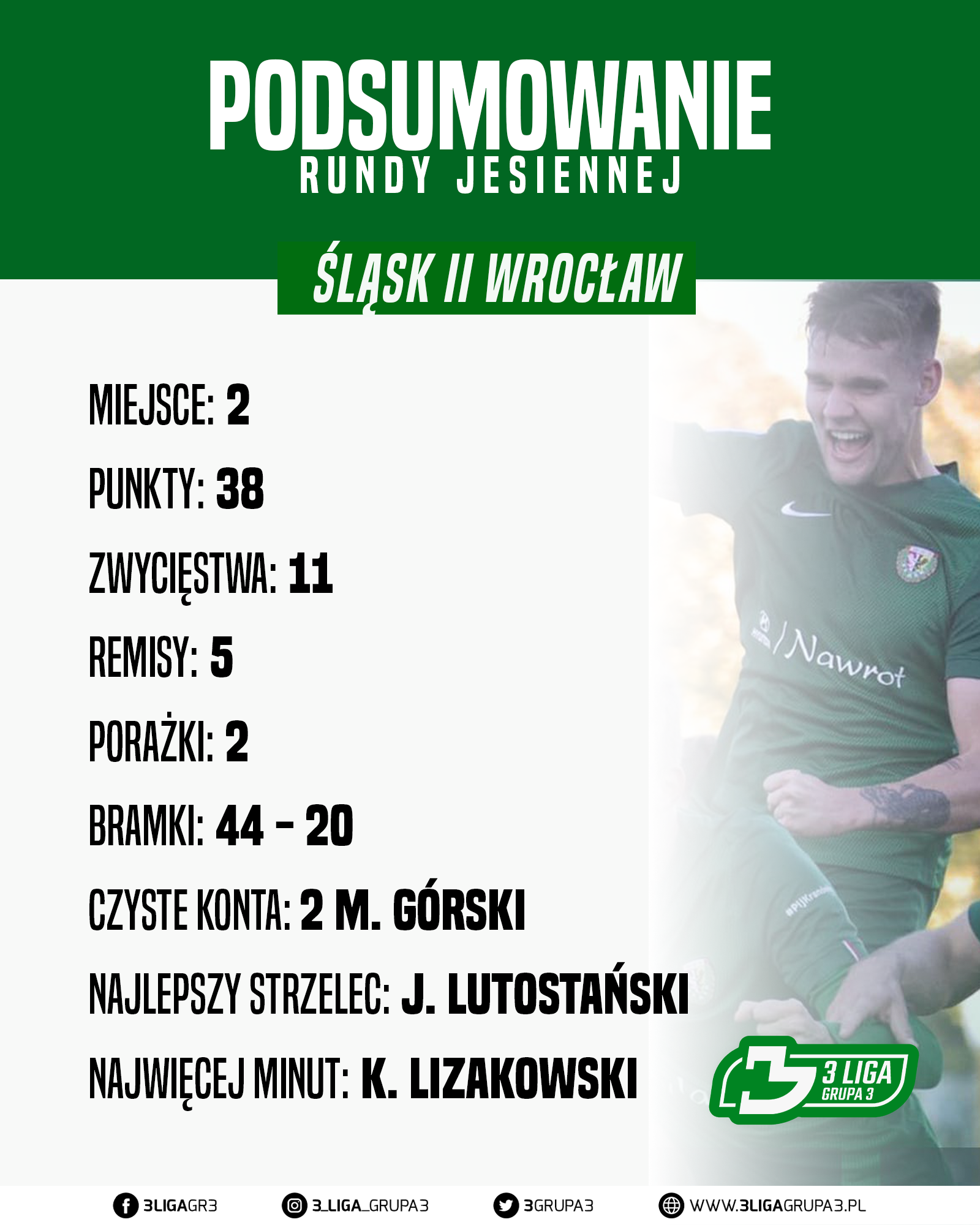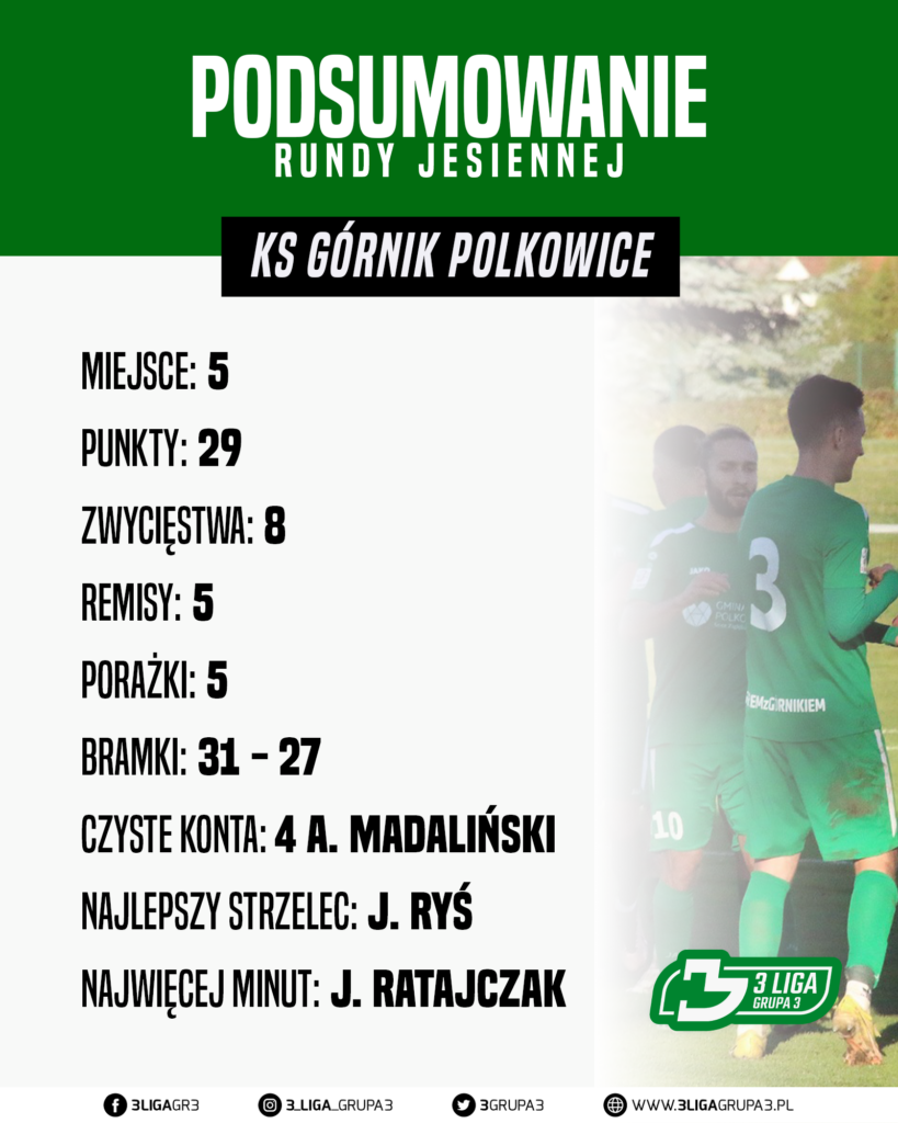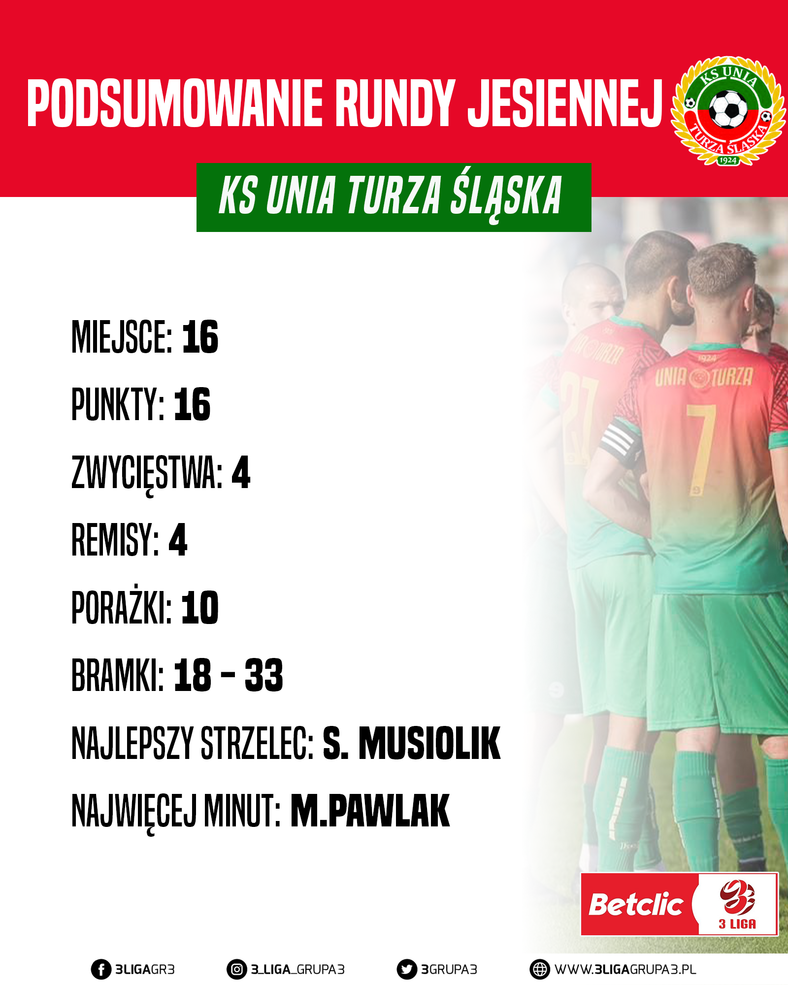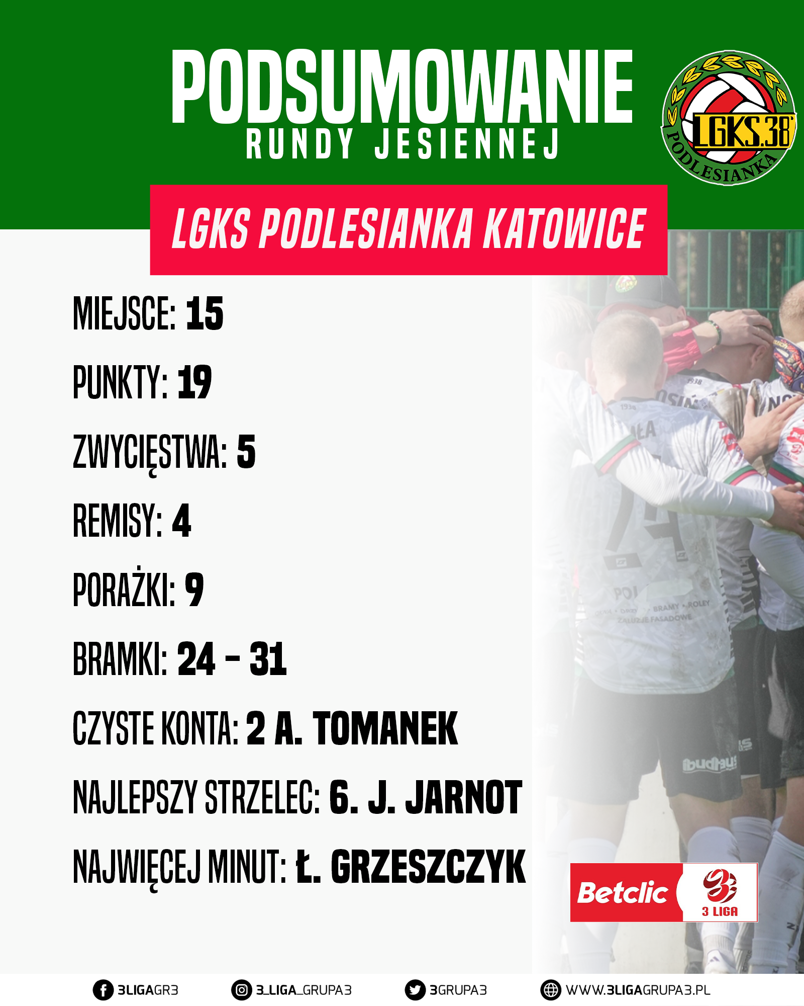Po pierwszej rundzie miejsce 15 zajmuje zespół LGKS Podlesianka Katowice (tegoroczny beniaminek) z dorobkiem 19 punktów odnieśli 5 zwycięstw, zaliczyli 4 remisy i przegrali 9 spotkań ich bilans bramkowy to 24 – 31. W trakcie tej rundy mieli lepsze i gorsze mecze, ale jak to mówią beniaminek uczy się tej ligi cały czas, tym bardziej że jest to bardzo silna 3 liga grupa 3. W tej drużynie gra 1 gracz z zagranicy. O to nasze krótkie podsumowanie po rundzie jesiennej (jeden mecz został rozegrany awansem z rundy wiosennej)