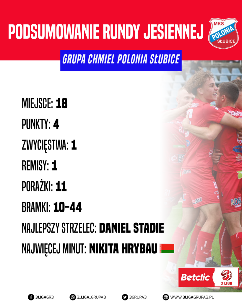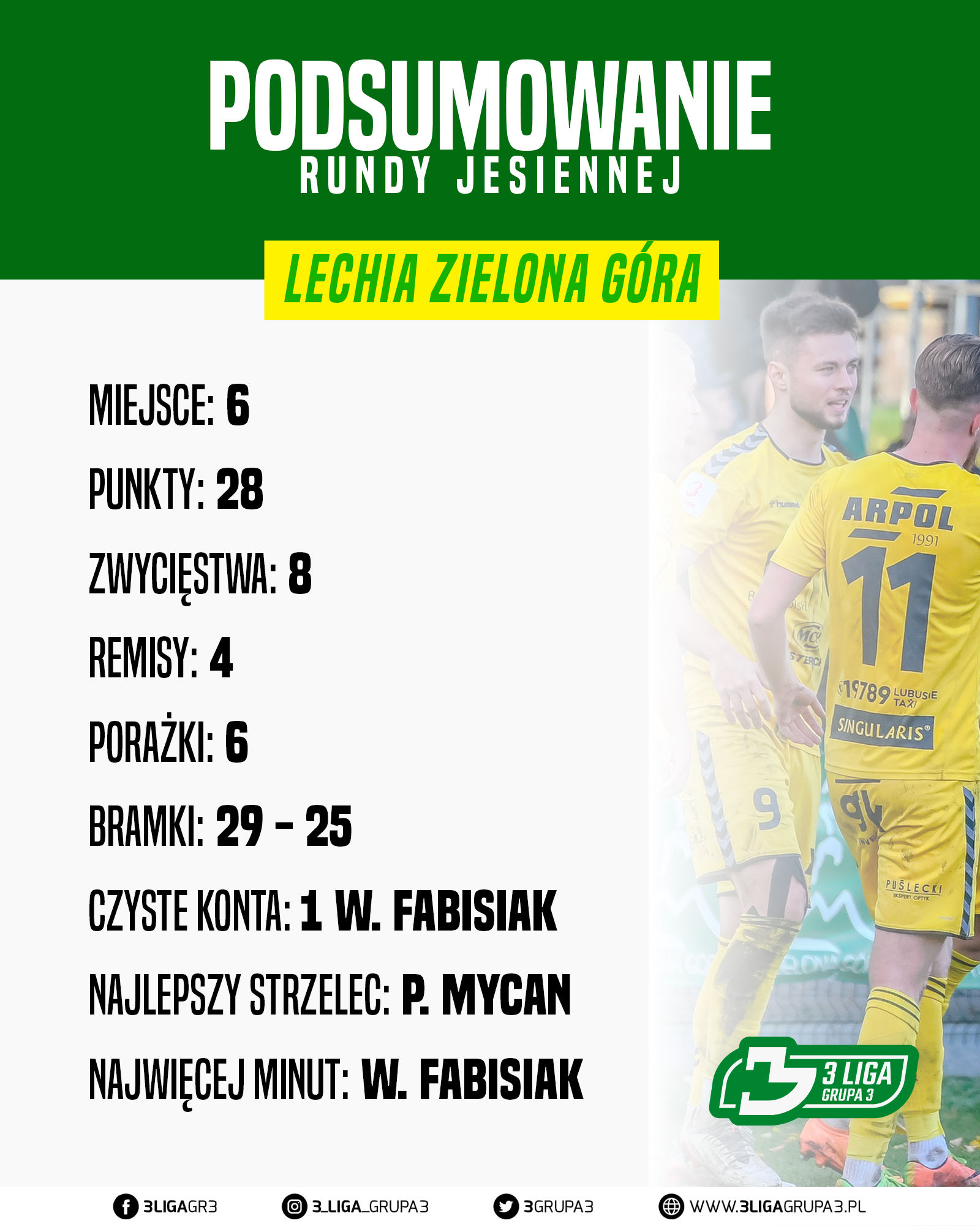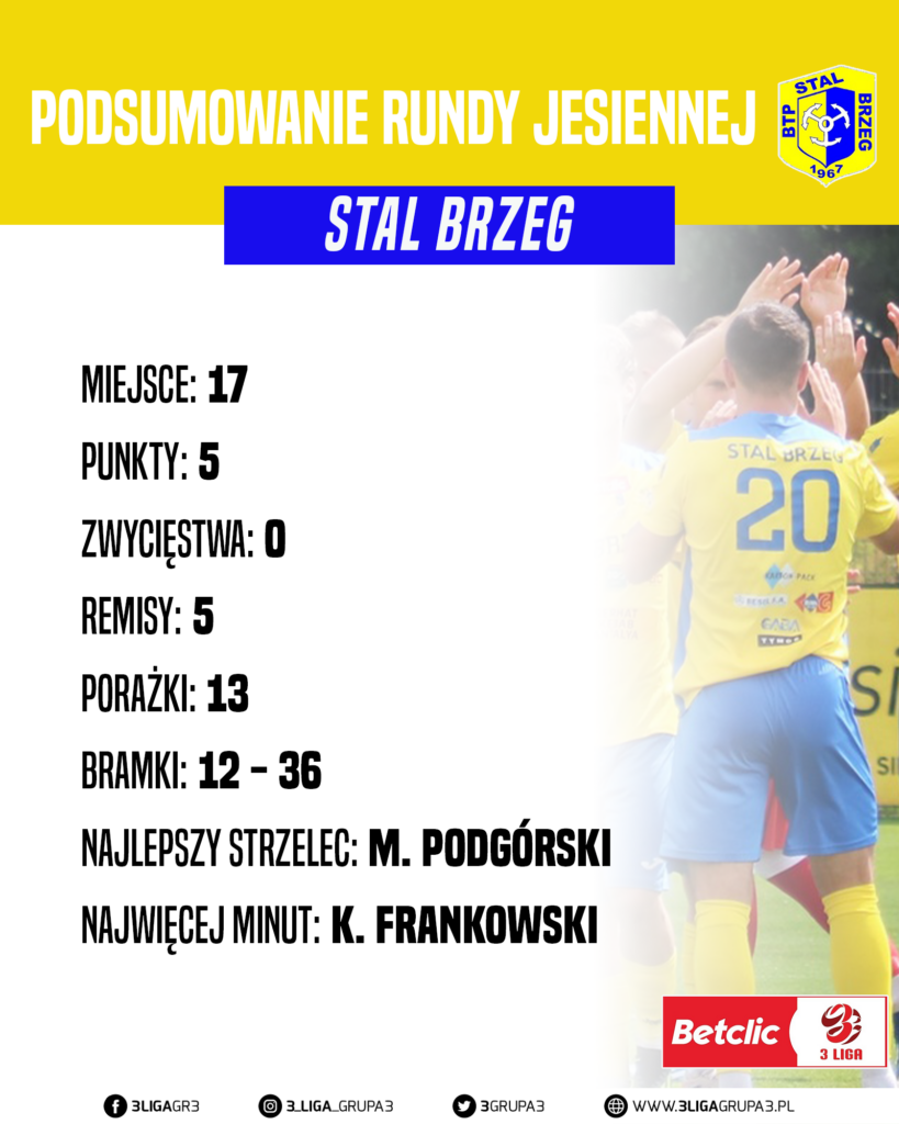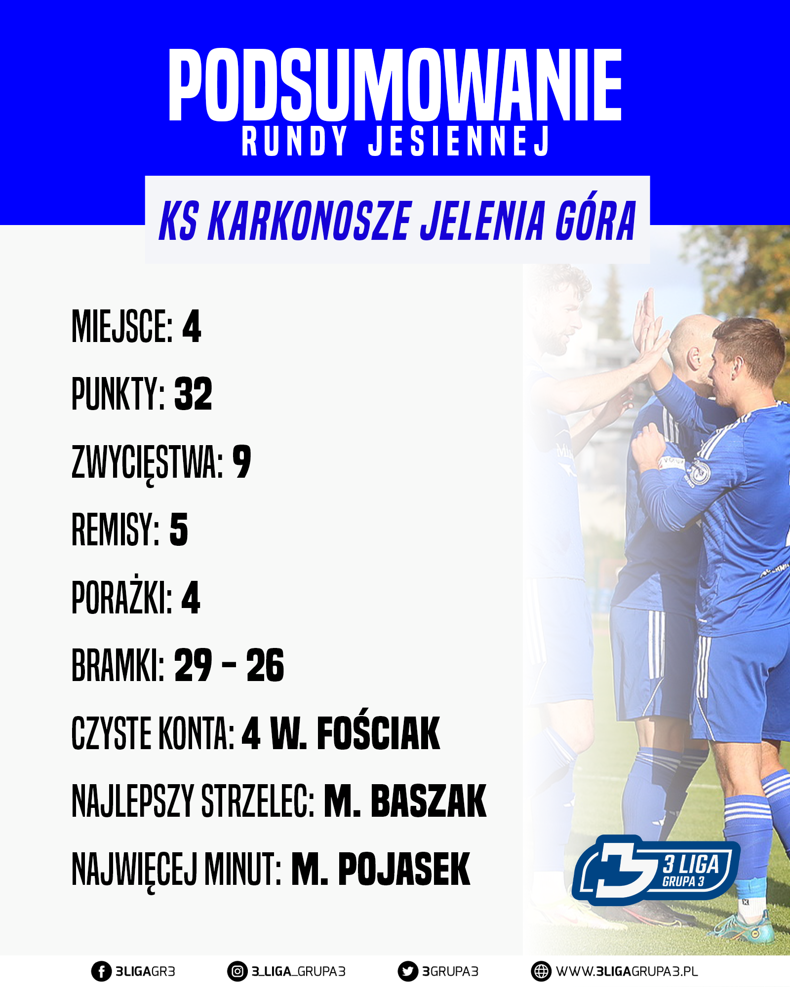 Po pierwszej rundzie miejsce 15 zajmuje zespół LGKS Podlesianka Katowice (tegoroczny beniaminek) z dorobkiem 19 punktów odnieśli 5 zwycięstw, zaliczyli 4 remisy i przegrali 9 spotkań ich bilans bramkowy to 24 – 31. W trakcie tej rundy mieli lepsze i gorsze mecze, ale jak to mówią beniaminek uczy się tej ligi cały czas, tym bardziej że jest to bardzo silna 3 liga grupa 3. W tej drużynie gra 1 gracz z zagranicy. O to nasze krótkie podsumowanie po rundzie jesiennej (jeden mecz został rozegrany awansem z rundy wiosennej)