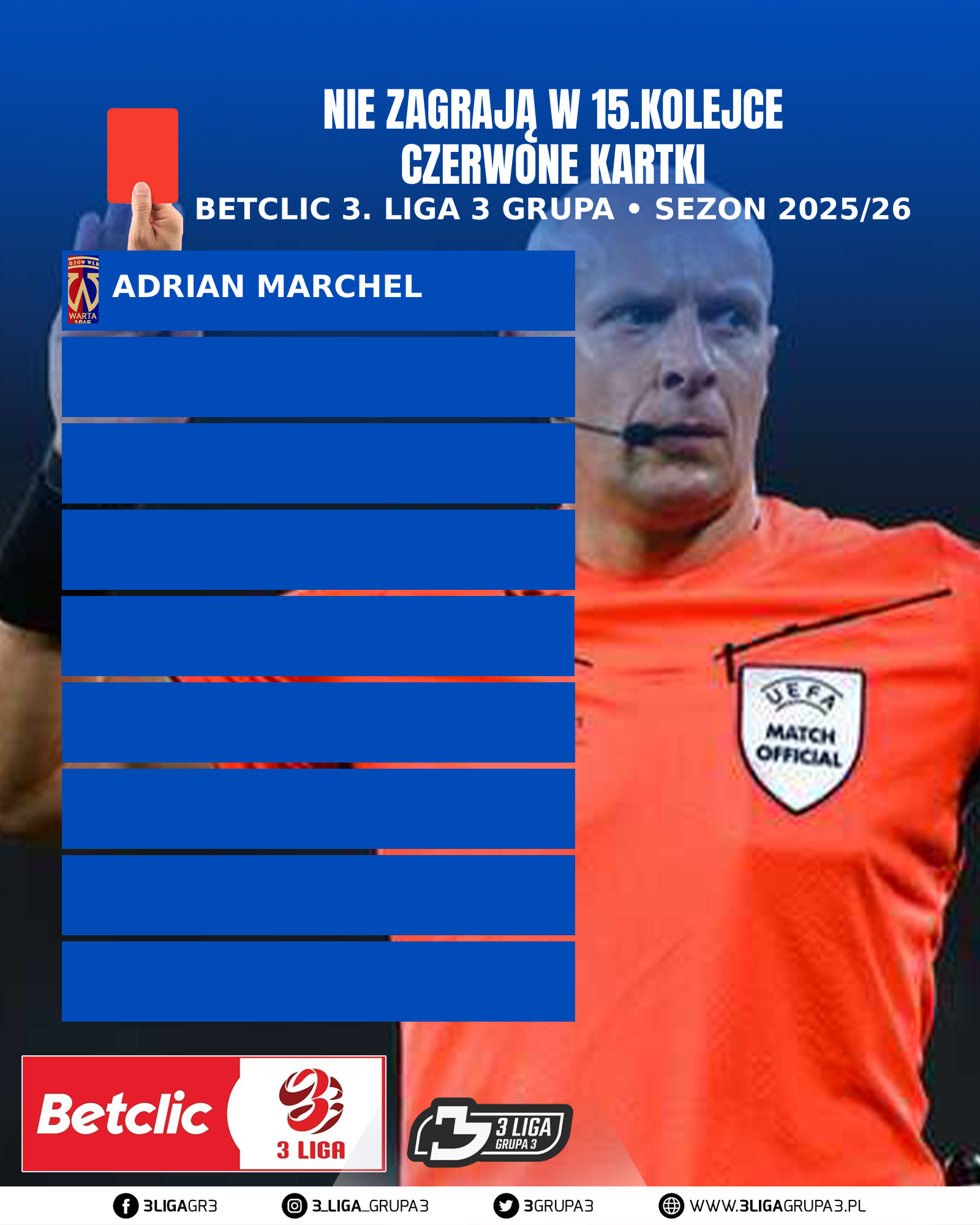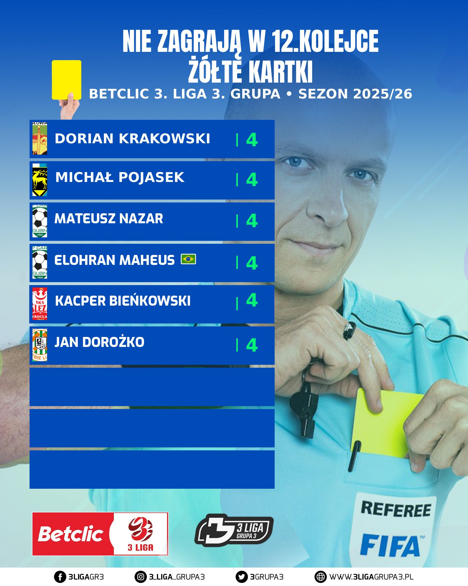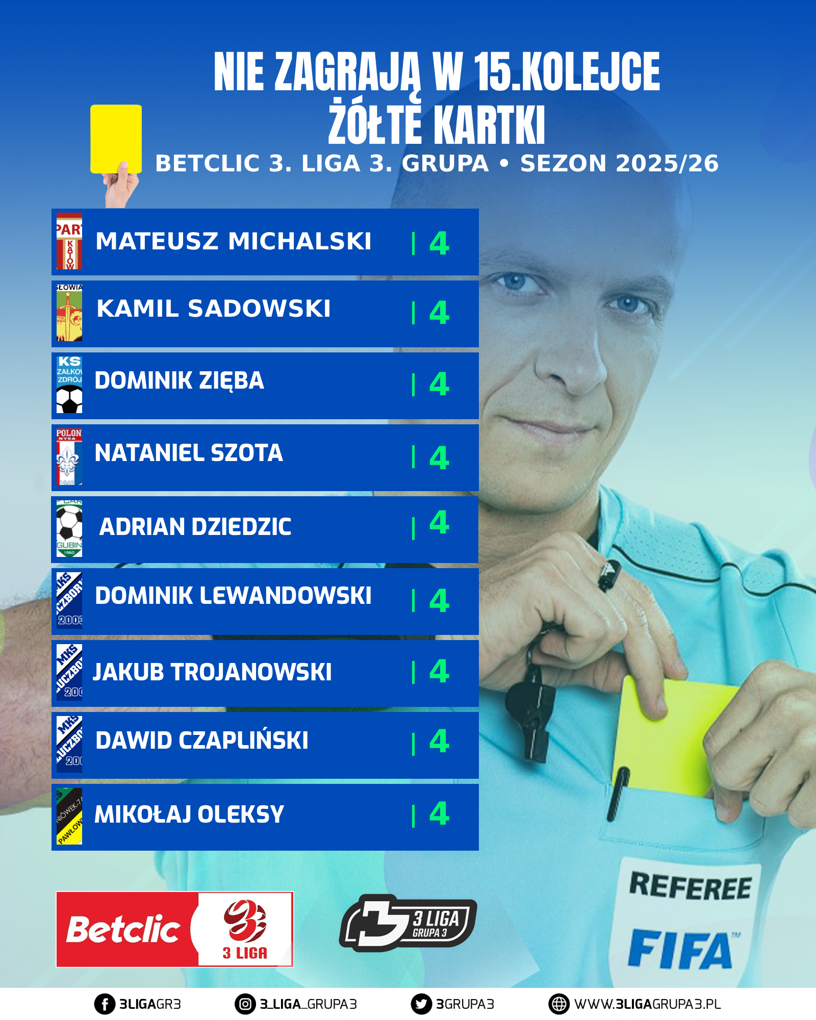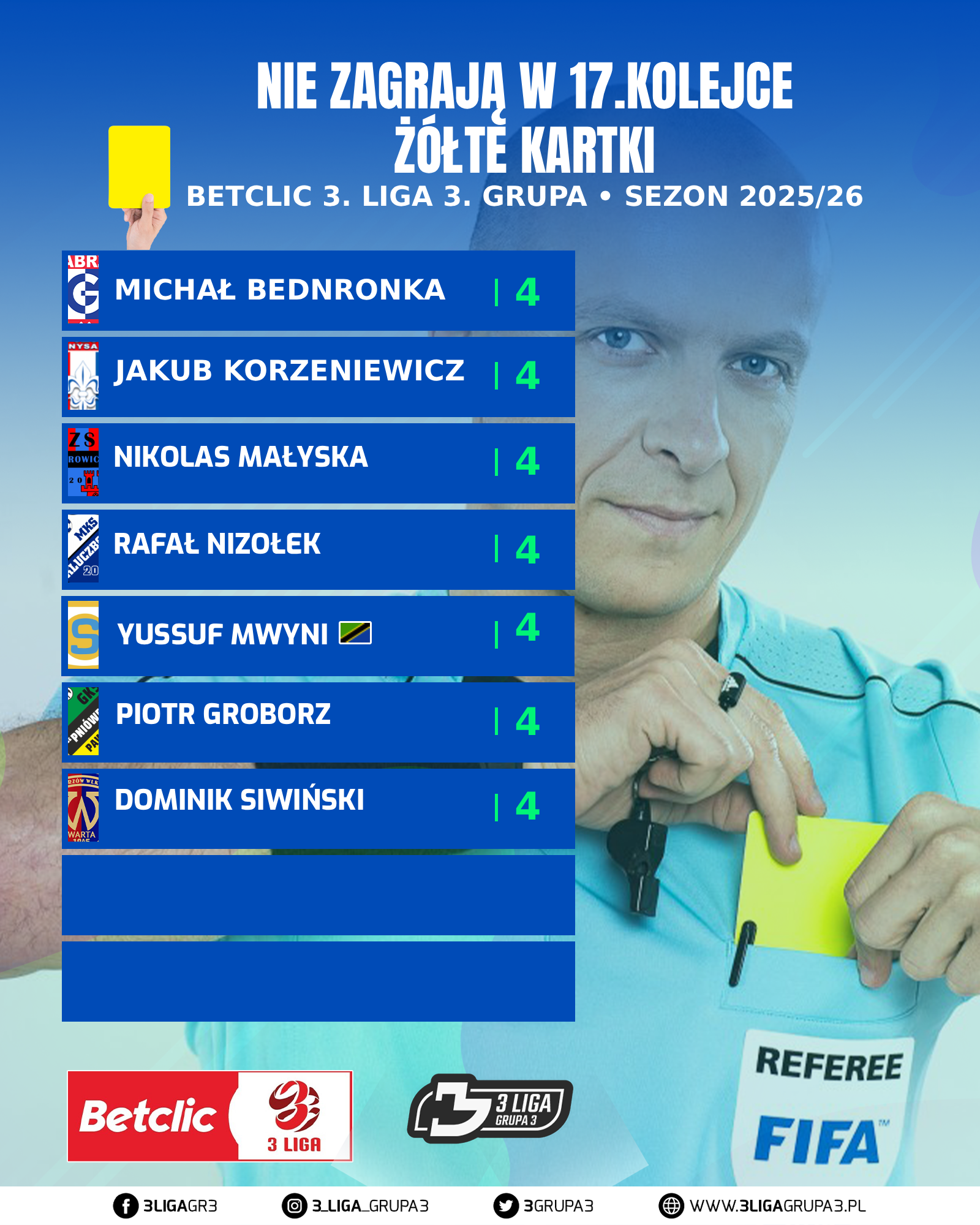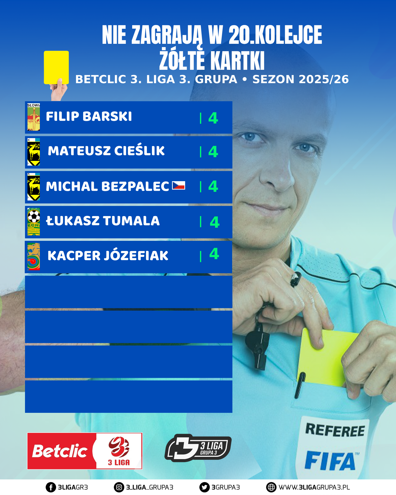 W 19 kolejce Betclic 3 Liga grupa 3 zostało rozegranych 3 z 9 spotkań sędziowie pokazali tylko 5
